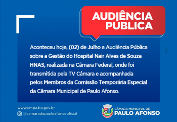 Aconteceu hoje, (02) de julho a Audiência Pública sobre a Gestão do Hospital Nair Alves de Souza - HNAS, realizada na Câmara Federal onde foi transmitida pela TV Câmara e acompanhada pelos membros da Comissão Temporária Especial da Câmara Municipal de Paulo Afonso, criada com o objetivo de discutir sobre a transição da Gestão do HNAS.