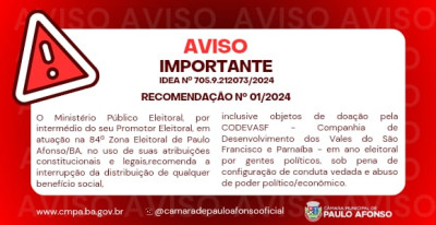 O Ministério Público Eleitoral, por intermédio do seu Promotor Eleitoral, em atuação na 84ª Zona Eleitoral de Paulo Afonso/BA, no uso de suas atribuições constitucionais e legais,recomenda a interrupção da distribuição de qualquer benefício social, inclusive objetos de doação pela CODEVASF - Companhia de Desenvolvimento dos Vales do São Francisco e Parnaíba - em ano eleitoral por gentes políticos, sob pena de configuração de conduta vedada e abuso de poder político/econômico.