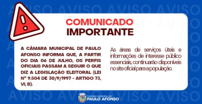 A Câmara Municipal de Paulo Afonso informa que, a partir do dia 06 de julho, os perfis oficiais passam a seguir o que diz a legislação eleitoral (lei n° 9.504 de 30/9/1997 - artigo 73, VI, b).