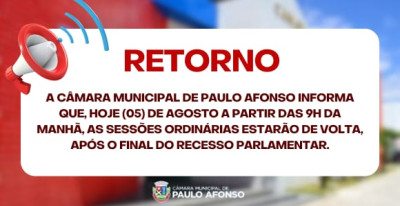 A Câmara Municipal de Paulo Afonso informa que, hoje (05) de agosto a partir das 9h da manhã, as Sessões Ordinárias estarão de volta, após o final do recesso parlamentar.