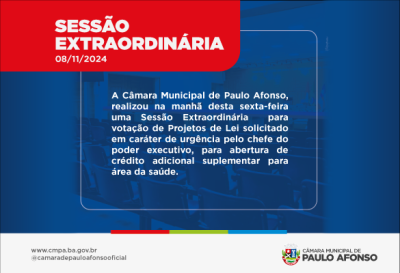 A Câmara Municipal de Paulo Afonso, realizou na manhã desta sexta-feira (08) de novembro, uma Sessão Extraordinária para votação de Projetos de Lei solicitado em caráter de urgência pelo chefe do poder executivo, para abertura de crédito adicional suplementar para área da saúde. O primeiro projeto foi solicitado o valor de R$4.854.500,00, enquanto o segundo projeto teve redução de valores devido emenda do líder da oposição o Ver. Jean Roubert, totalizando R$3.577.000,00.
