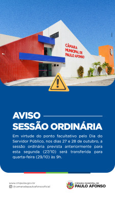 Em virtude do ponto facultativo pelo Dia do Servidor Público, nos dias 27 e 28 de outubro, informamos que a sessão ordinária, anteriormente prevista para segunda-feira (27/10), foi transferida para quarta-feira (29/10) ás 09:00 horas