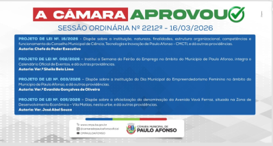 Na 2212ª Sessão Ordinária, realizada no dia 16 de março de 2026, a Câmara Municipal de Paulo Afonso aprovou projetos de lei relevantes para o desenvolvimento social, econômico e institucional do município de Paulo Afonso.