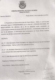 Através do Decreto Nº 008/2012, o presidente da Câmara Municipal de Paulo Afonso, Regivaldo Coriolano, no uso das atribuições que lhe são conferidas pela Lei Orgânica do Município e pelo Regimento Interno da Casa, determinou "Ponto Facultativo" no Poder Legislativo, no dia 10 de setembro (segunda-feira), considerando que os dias 07 (Feriado Nacional da Independência do Brasil), 08 e 09 de setembro serão destinados as comemorações festivas do evento Copa de Velas, considerando ainda que no dia 10, a Associação dos Comerciários de Paulo Afonso resolveu transferir seu feriado comemorativo para esta data.
