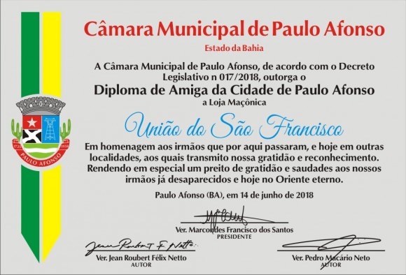 15/06/18Loja Maçônica União do São Francisco, recebe Diploma de Amiga da Cidade de Paulo Afonso