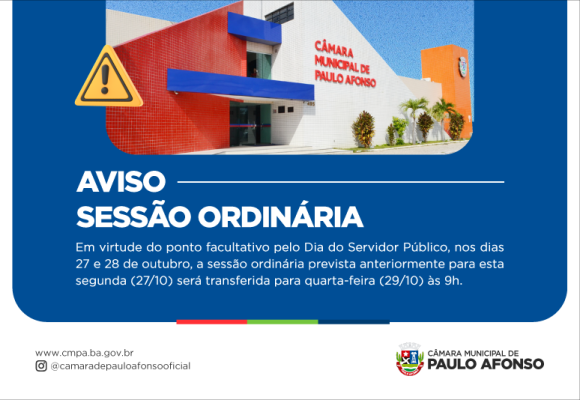 24/10/25Aviso Importante: Sessão Ordinária é Transferida para Quarta-Feira (29/10),ás 09:00 horas.