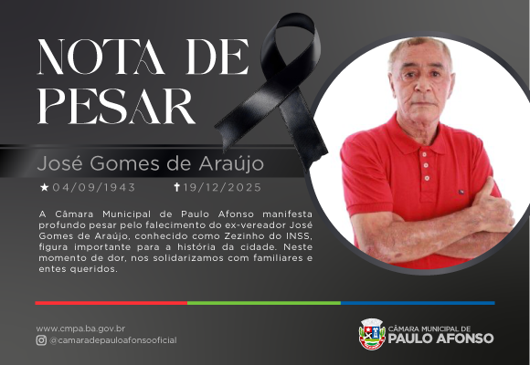 19/12/25A Câmara Municipal de Paulo Afonso lamenta profundamente o falecimento do ex-vereador José Gomes de Araújo, popularmente conhecido como Zezinho do INS