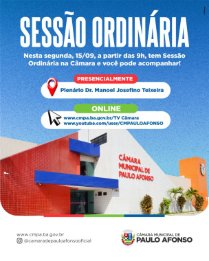 12/09/25Nesta segunda-feira, 15 de setembro, a partir das 09h, mais uma Sessão Ordinária.