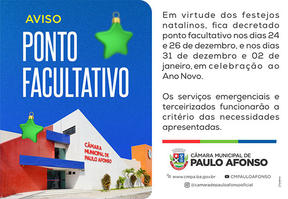 24/12/25A Câmara Municipal de Vereadores de Paulo Afonso deseja a todos os cidadãos e cidadãs um Natal de paz, união e esperança.