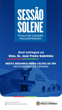 12/09/25Sessão Solene dia 15/09/2025 - Título de Cidadão Pauloafonsino ao Ilmo. Sr. José Freire Sobrinho, de autoria do Vereador Valmir Araújo Rocha
